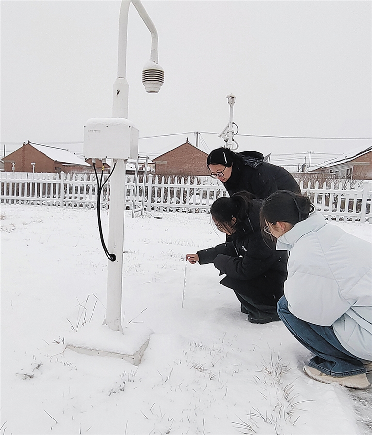 涞源县气象局观测人员在观测场测量雪深。 张妤 摄