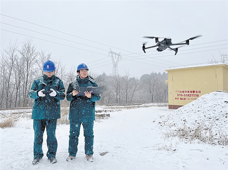 国网保定供电公司输电运检中心工作人员用无人机对易县电力铁塔进行巡视。 朱彦华 摄