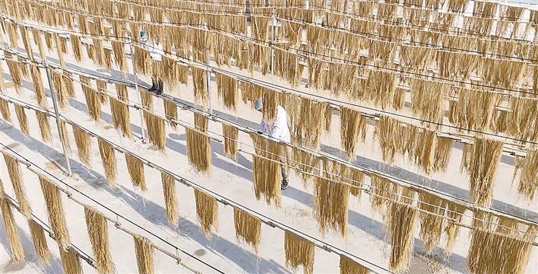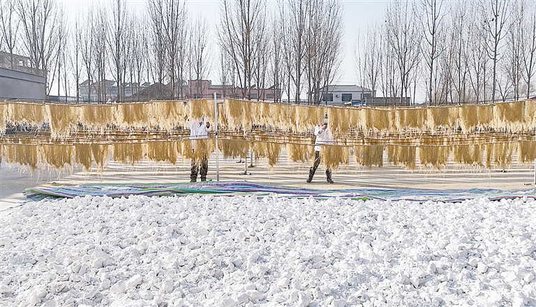 清洗、粉碎、过滤、打芡、漏粉、捋粉、冷冻、晾晒……1月5日,高阳县贾家务村聚兴土地专业合作社内,一排排晶莹剔透的粉条高高挂起,宛如丝帘。