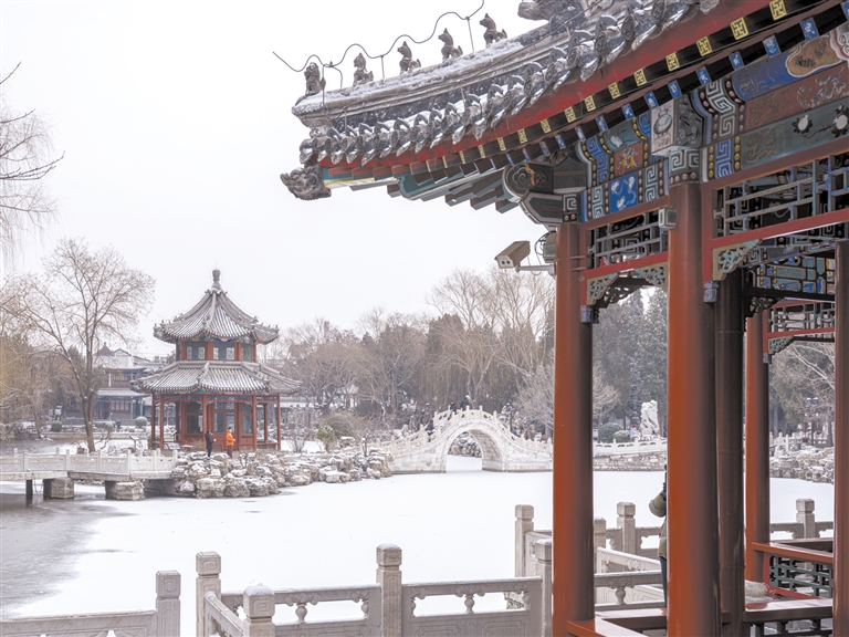 | 古莲花池的红柱黛瓦在雪花中格外醒目。罗大庆摄 |