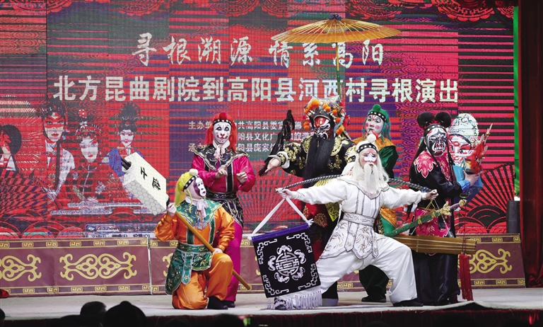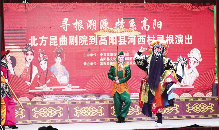 3月20日是农历二月初二,高阳县庞家佐镇河西村村口搭起的戏棚里,掌声、喝彩声、欢笑声交相呼应,此起彼伏。北方昆曲剧院的艺术家们又来寻根义演了。他们带来《小放牛》《宝剑记·林冲夜奔》《天下乐·钟馗嫁妹》等经典剧目,为河西村以及四面八方赶来的乡亲们奉上了一道丰厚的文化大餐。