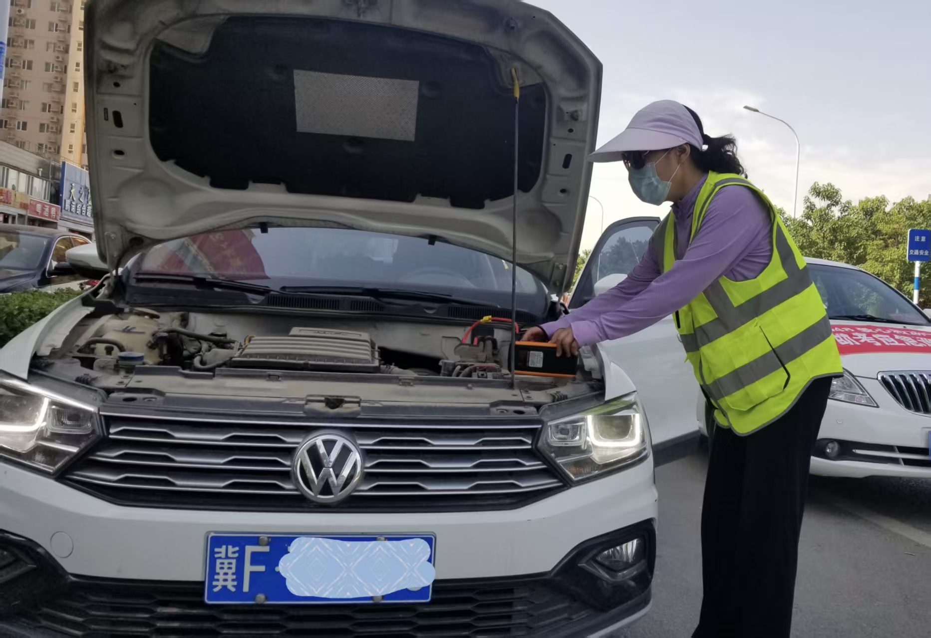 | 交通广播116号信息员冯薇救援亏电车辆。受访者供图 |