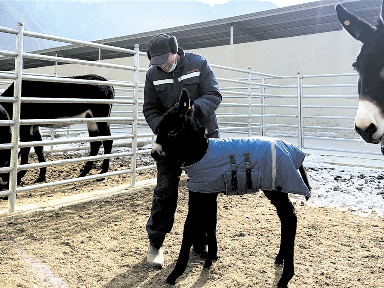 | 饲养员王成龙正投放草料、检查驴舍、照料幼驴。 |