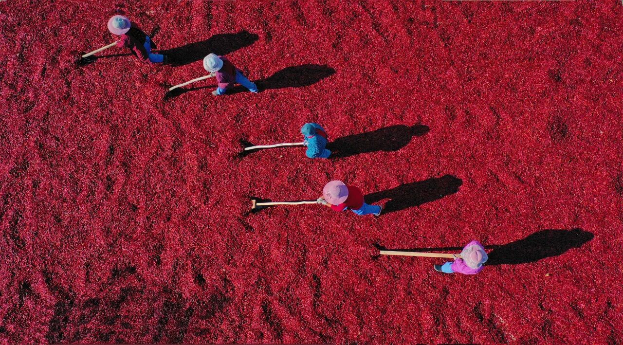 望都椒农在辣椒堆中忙碌晾晒,鲜红的辣椒映出丰收的红火图景。 孙威 摄