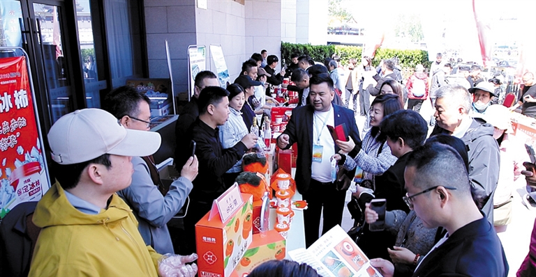 展销现场人气高涨。易县保定冰柿凭借“冰爽绵蜜”“树上的冰激凌”的独特口感,成为全场焦点,试吃区人头攒动,不少嘉宾品尝后当场选购带走。中午举行的易县专场直播中,冰柿更是作为核心产品被重点推介,线上线下同步热销。