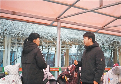 | 1月5日,河北省曲阳县永宁社区永宁花园小区内,社区干部(右)向居民了解车棚使用情况。受访者供图 |