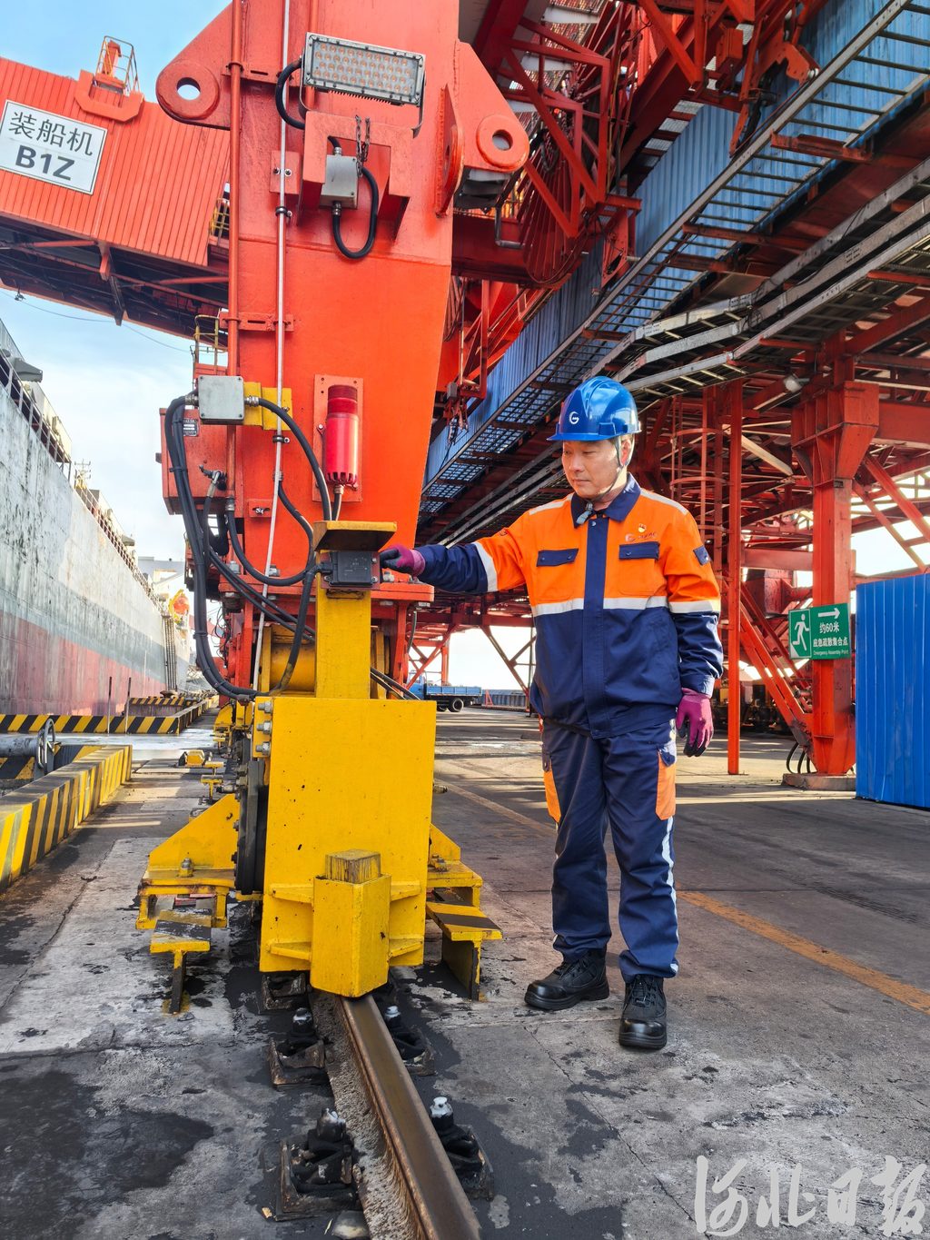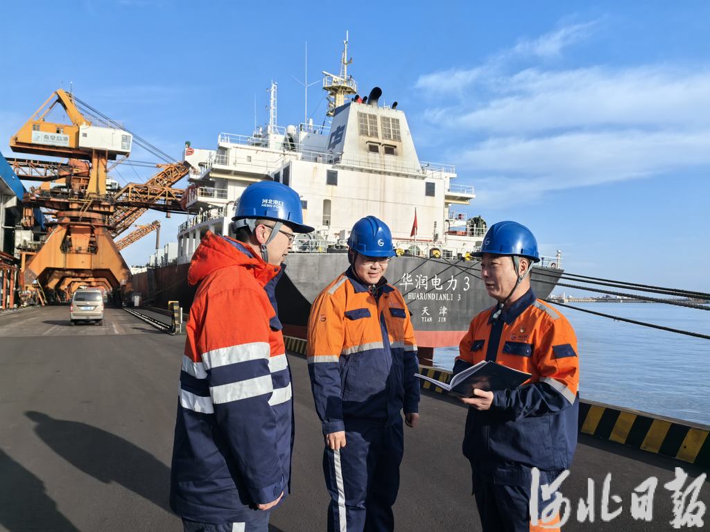 1月19日,在河北港口集团秦皇岛港股份有限公司200泊位,浦东3号船静静停靠,堆场上的煤炭通过取料机、皮带机、装船机被传送至船舱。码头上,省人大代表、河北港口集团秦皇岛港股份有限公司第二港务分公司装船一部副部长李伏玉在检查环保抑尘设备工作情况。