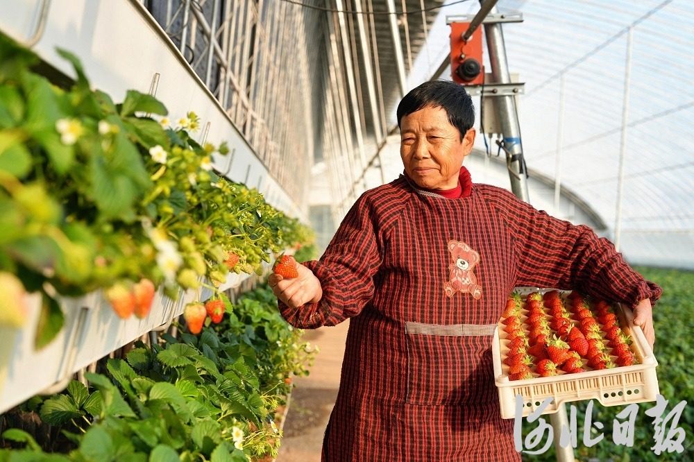 2月2日,正定县塔元盛世乡村振兴农业科技示范园内,农民在大棚内采摘草莓。河北日报记者王伟摄