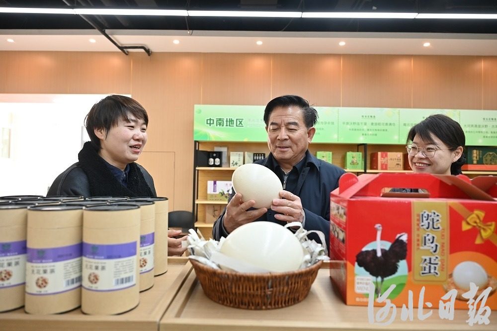 2月1日,在正定县塔元庄村“直播楼”,村党委书记、村委会主任尹计平(右二)查看展销的特色商品。河北日报记者张晓超摄
