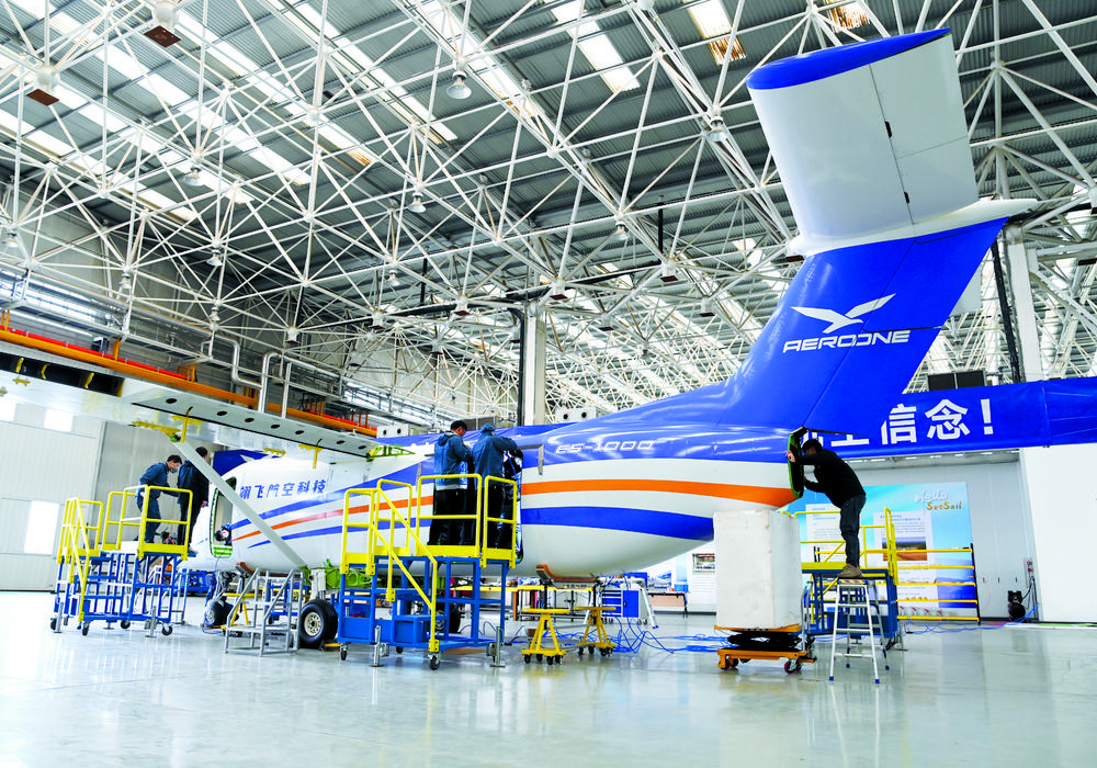在位于河北省石家庄装备制造产业园的翊飞航空科技(石家庄)有限公司,工作人员在进行大型无人运输机的研发。记者张震摄(资料图片)