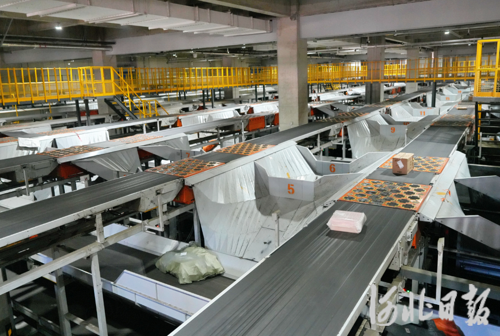 2025年12月9日,在位于固安县的申通快递华北转运中心,智能分拣设备正在分拣快递包裹。河北日报记者王伟摄