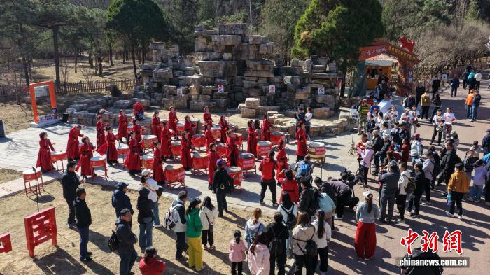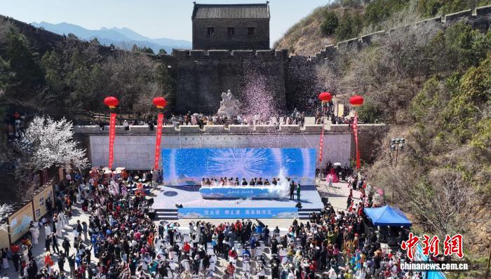 4月4日,游客在金山岭长城景区观看表演。(无人机照片)梁志青摄