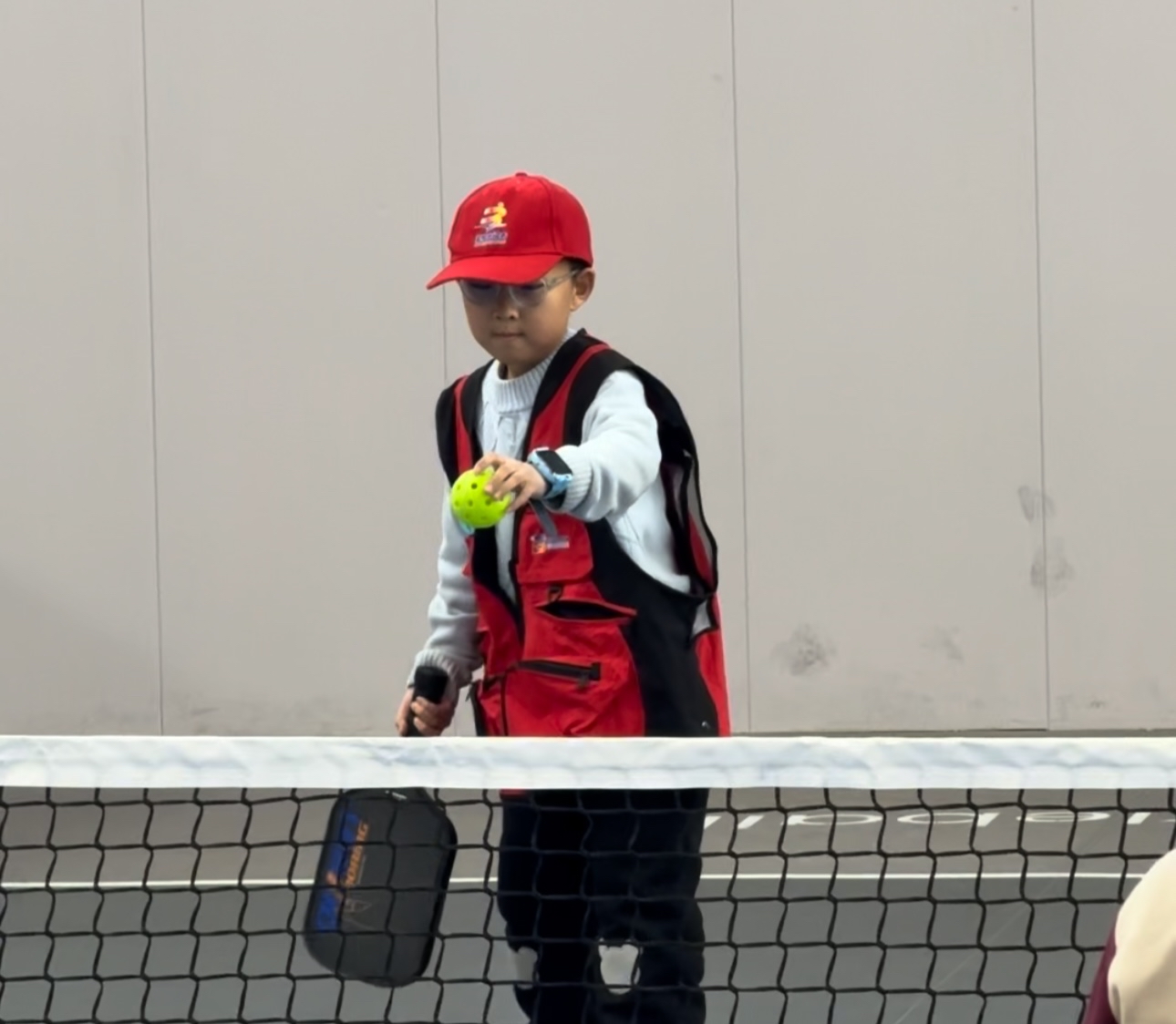 热身环节,小记者们跟随教练依次活动身体各个部位。简单的关节活动后,孩子们迅速进入状态。“大家看我,虎口对准拍柄的这个棱角,像握手一样握住它。”教练细致讲解匹克球拍握法。